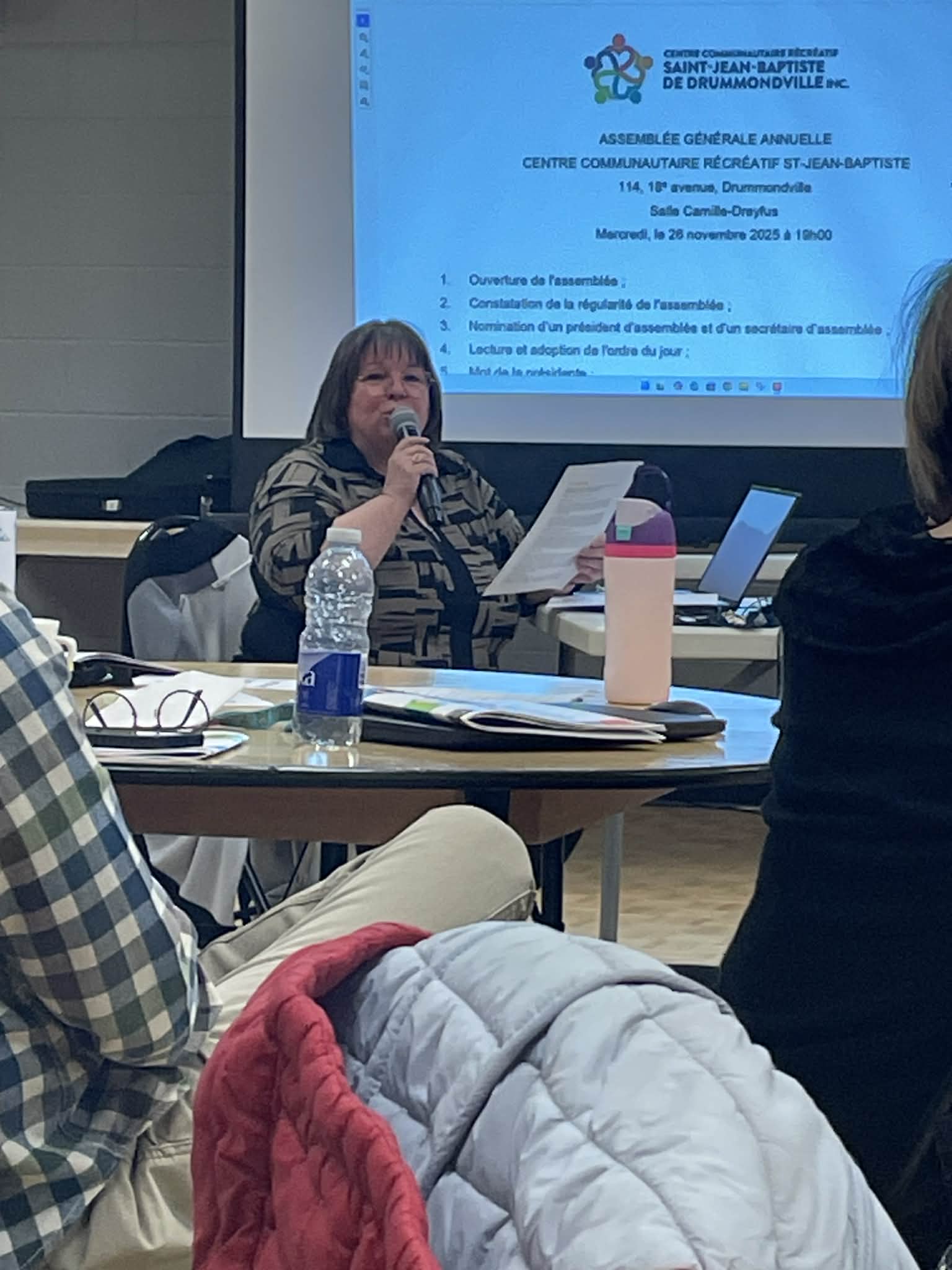 Celle-ci s'est tenue ce mercredi 26 novembre avec près d'une quarantaine de personnes présentes. Ce fut une belle assemblée présidée par Mme Marie-Eve Bergeron de la Corporation de développement communautaire de Drummondville communément appelée CDC Drummond.