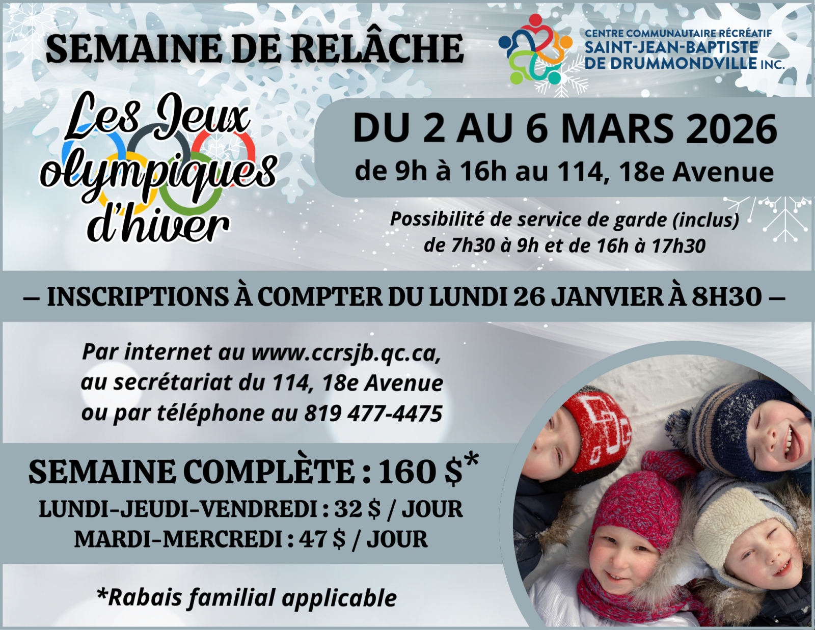 Les inscriptions se prennent directement au secrétariat du 114, 18ᵉ Avenue, à partir du 26 janvier 2026.