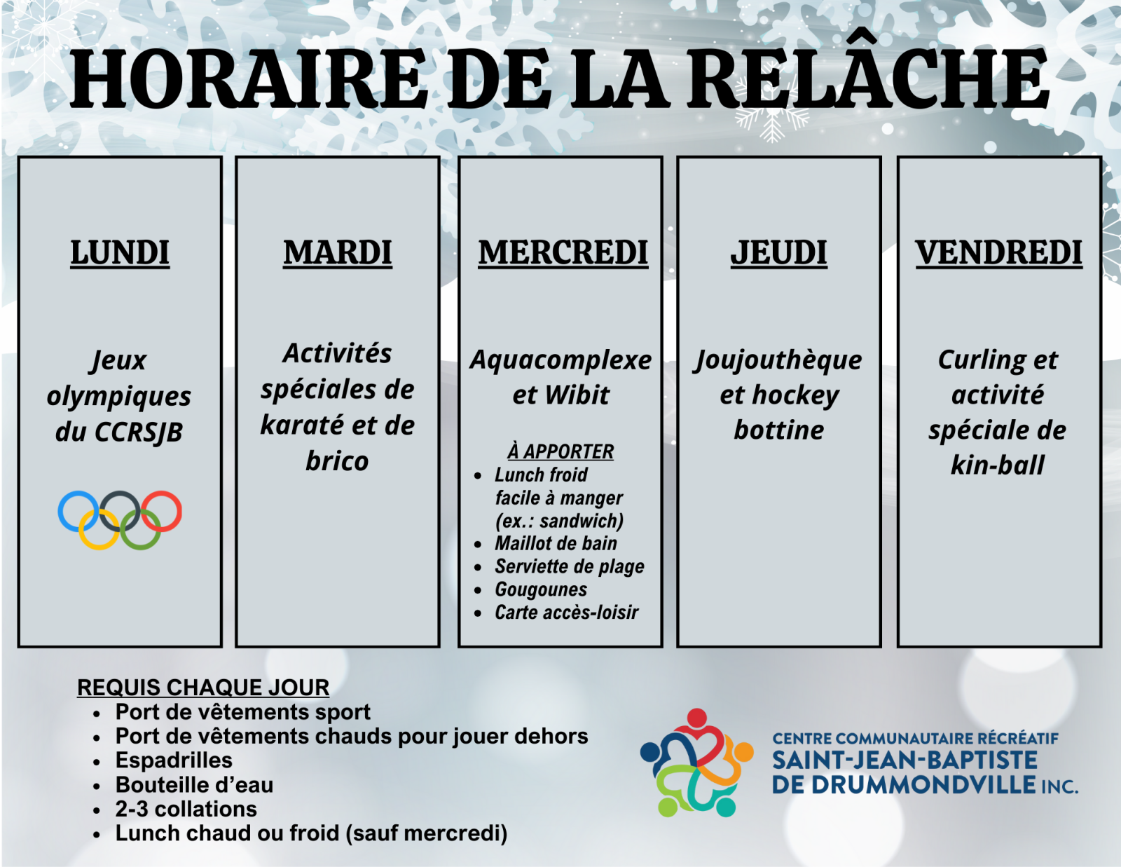 Cette année, la semaine de relâche sera synonyme de sport, d'équipe et de plaisir pour les petits comme les grands ! Venez vous amuser avec nous du 2 au 6 mars 2026 ! Au programme : Olympique du camp, brico mascotte, joujouthèque, et bien plus ! Les jeunes iront également s'amuser dans le Wibit de l'aquacomplexe mercredi lors d'une sortie !